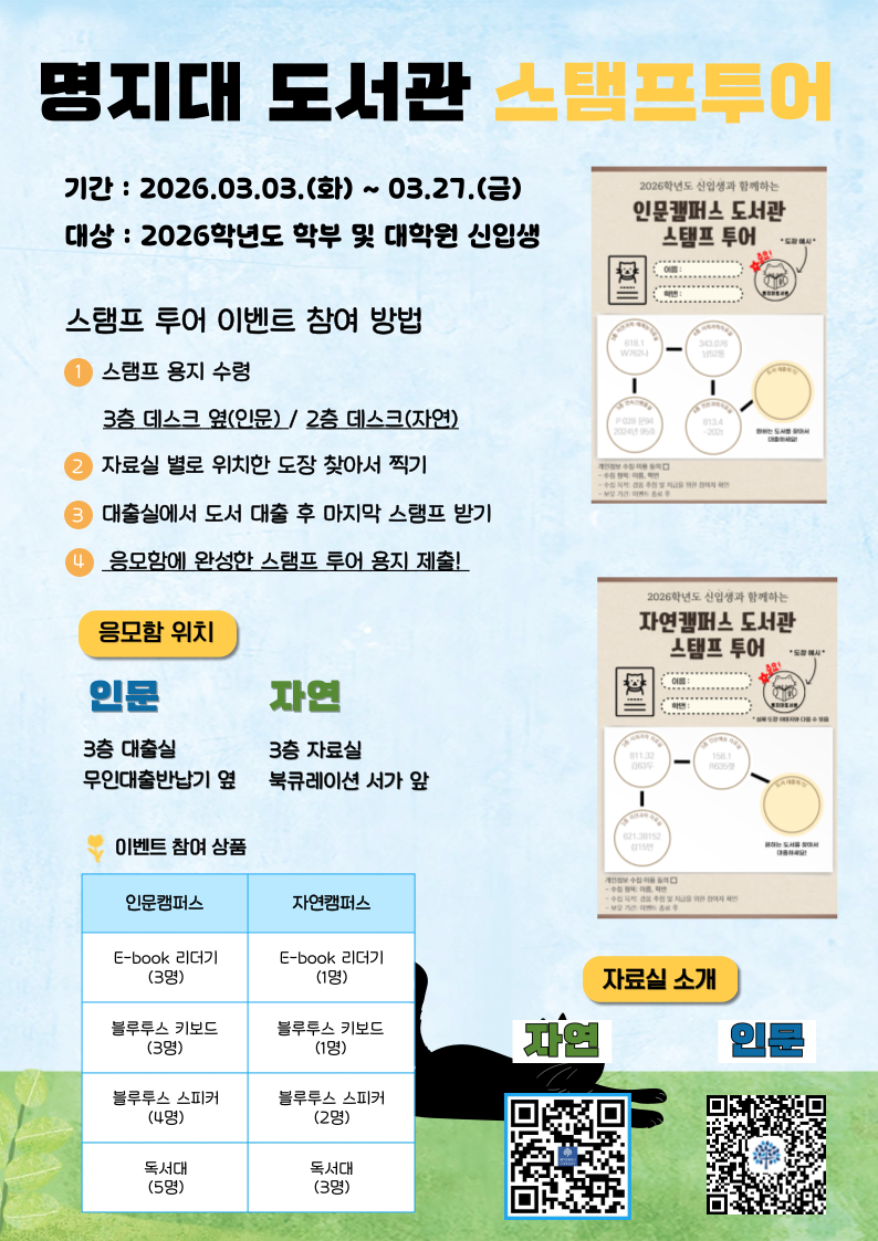 [도서관] 2026학년도 신입생과 함께하는 명지대 도서관 스탬프 투어 (~'26. 3. 27. (금) 22:00까지)