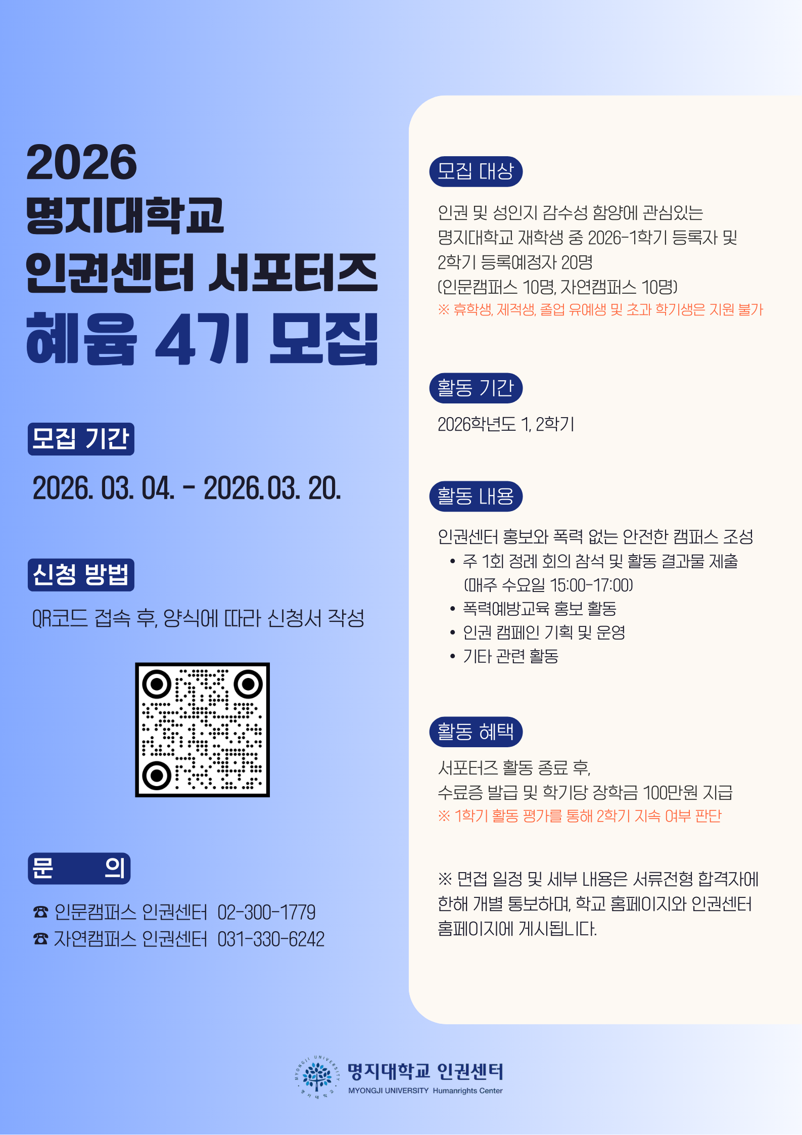 1. 모집인원 및 대상: 인권 및 성인지 감수성 함양에 관심 있는 명지대학교 재학생 중 2026-1학기 등록자 및 2학기 등록예정자 20명