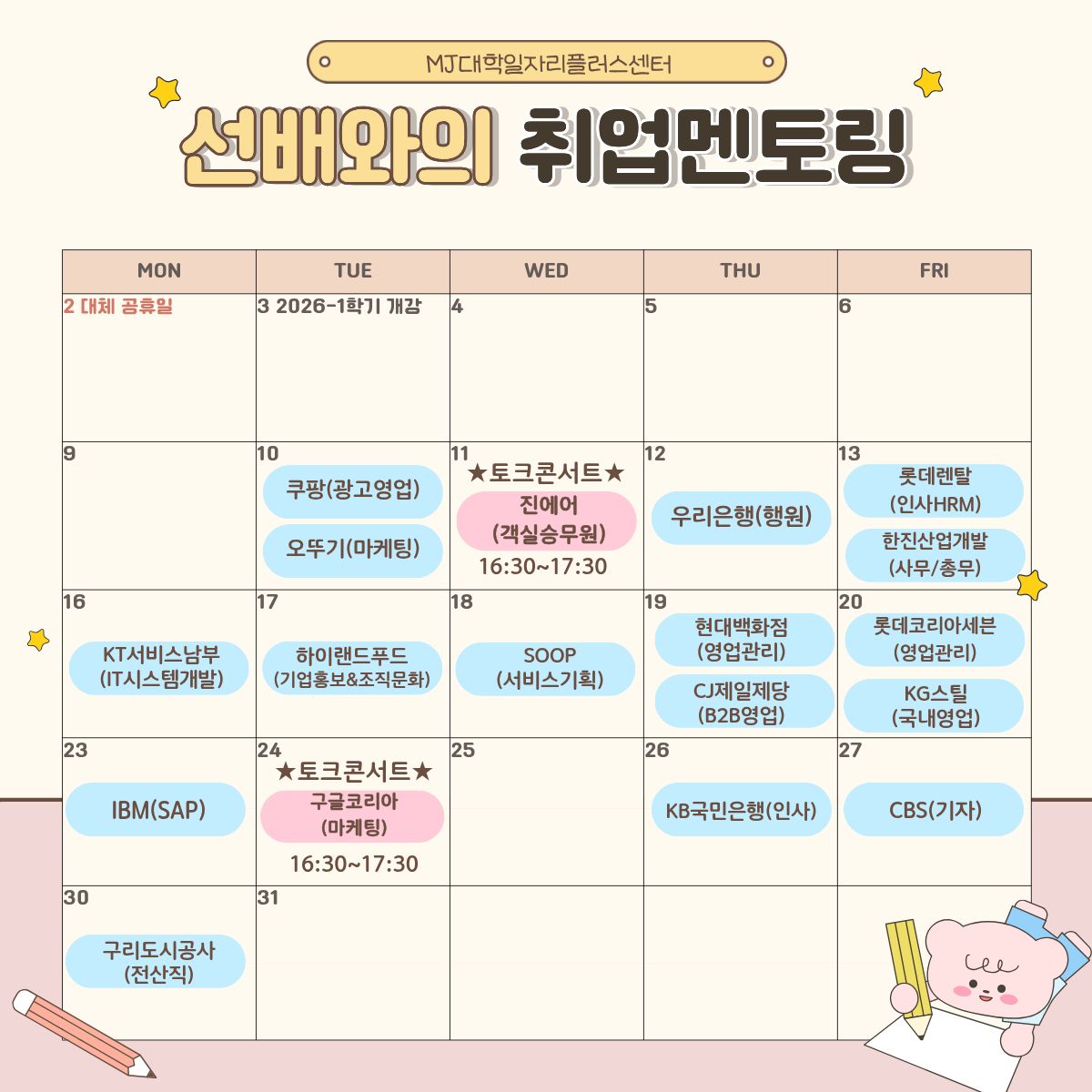 2. 운영일시: 2026. 3. 10.(화) ~ 3. 30.(월), 일대일 멘토링 10:00~16:00 / 토크콘서트 – 16:30~17:30