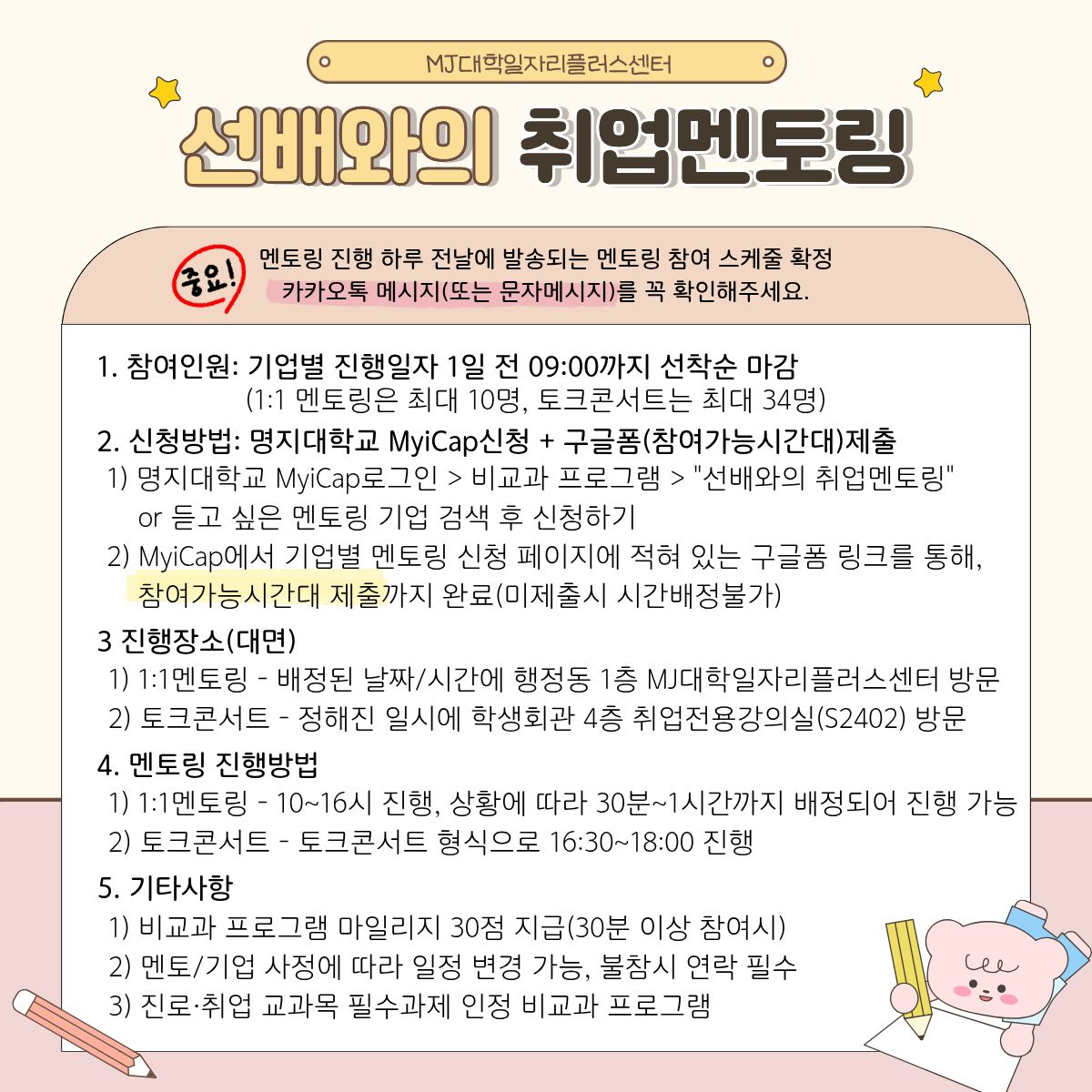 ④ 1:1 멘토링: 예정된 날짜/시간에 MJ대학일자리플러스센터에 방문하여 상담